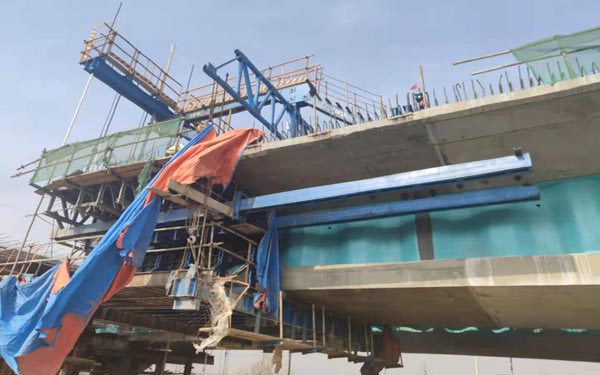 6、在底模蕩移前,必須詳細檢查掛籃位置、后端壓重及后吊桿安裝情況是否符合要求。應先將上橫梁兩個吊帶與底模下橫梁連接好,確認安全后,方可蕩移。